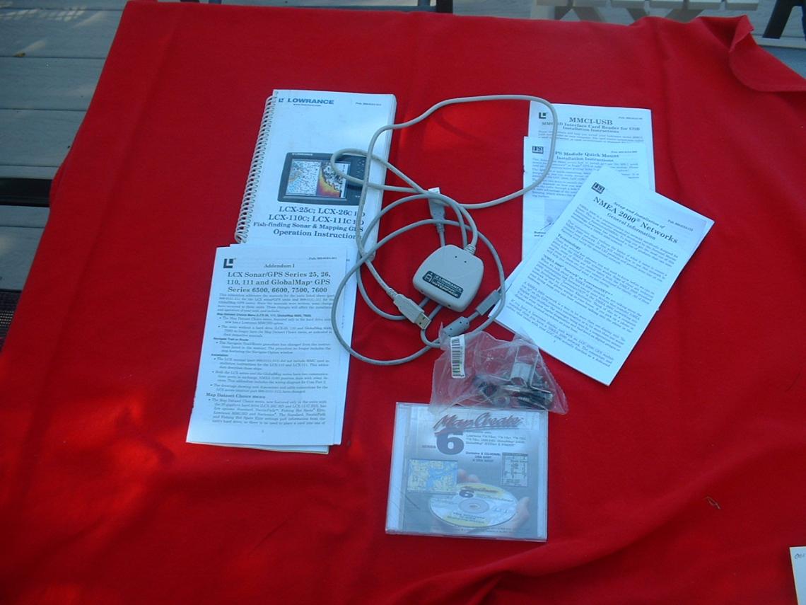 Other items included in this sale are: Manuals for the LCX 25Instructions for the NMEA 2000 network set-up and installation, one MMCI-USD Interface SD card reader, one computer cable, one CD Map Create 6, and one exterior Transducer mounting bracket.
