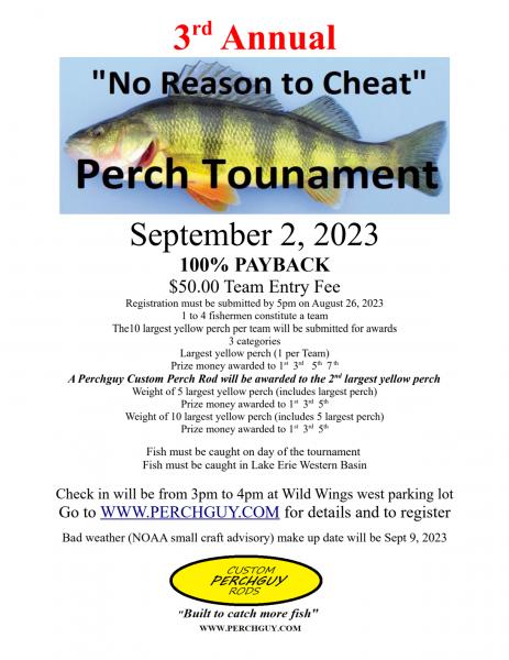 Thanks to all the participants and sponsors of the 2022 No reason to cheat Perch Tournament. Results are posted on the Tournament web site.