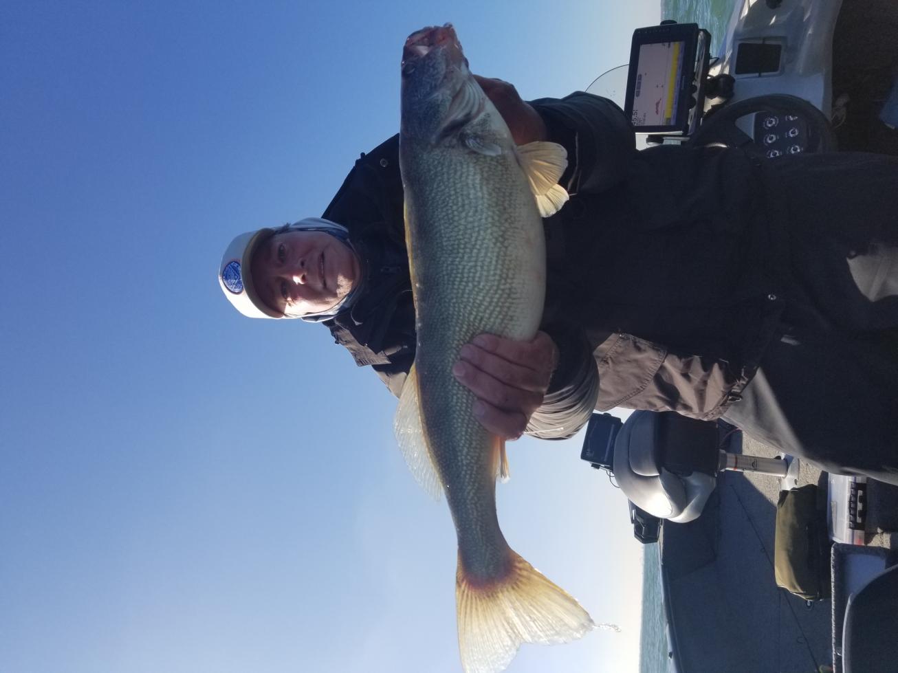 Thanks Bob for all of the help/advice this week. We did get out and started trolling east of the Dumping Grounds south of Kellys. We trolled for about 3 hours before hitting some smallmouth action. We were marking a lot of schools between 20 and 38 feet but only caught 2 walleye. We mixed up the colors, slowed down to 1.7 mph and then sped up to 2.5 mph. We used snap-ons with 2 oz weights but could not get a lot of bites, not sure why. The good news is that the 1 walleye we did catch was huge - 32 inches and it weighed 11 pounds. My friend slowly muscled it in over 15 minutes. It was 100 ft back and we caught her on a Neon Shad Bandit, no weights. 42 ft of water. Biggest walleye I ever seen. I attached a picture. Gorgeous day yesterday and the waves were not a problem at all. We also caught a few smallmouths. We had a blast - thank you again. Attachment 6657