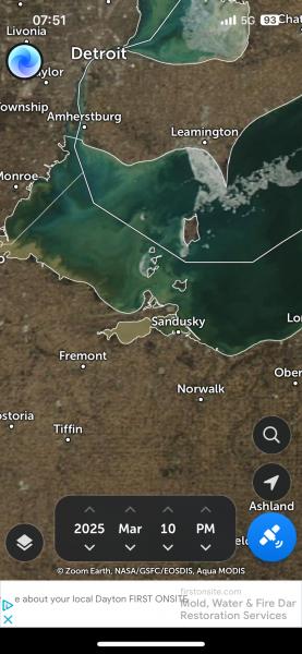 This is the kind of ice that is floating around out there - photo below. Even if you think an area is ice free, you never know when you might encounter pieces like this. I saw these last Wednesday. They are at least 8 inches thick. Many are a lot thicker. The other photo is from the Perry Monument webcam this morning. Ice is still locked in NW of South Bass Island. Modis satellite photos show a lot of ice on the Lake. Again, wind and currents move this ice around. An area that is "ice free" can have ice in just a few hours.